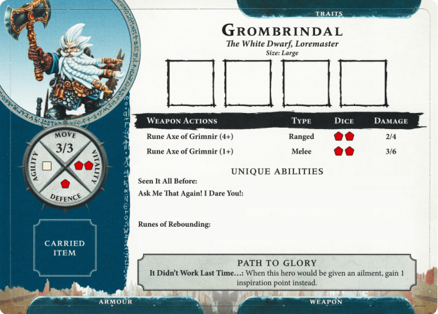 I got my hands on the latest iteration of Grombrindal, the White Dwarf. White Dwarf 500 has rules for Cursed City, Age of Sigmar, Underworlds, and Warcry. I’m most interested in Cursed City and hope to try him out in the next week. Always Board Never Boring goes over his rules. He’s a Loremaster in Cursed City, which is interesting because his stats are very stalwart-ey and he has no spells. Oh but that axe! He’s going to do some damage. Admittedly, this is a splurge purchase and at nearly $40 US, it’s pretty steep for one single-little-itty-bitty piece of plastic. But, I’m a bit of a white dwarf collector, so I can stomach this one. Having game rules definitely helps too. I’ve been somewhat critical of the tiny pieces in some GW sets. Not so here! Look at these beautiful chunky pieces! This thing went together great, no fiddley…
