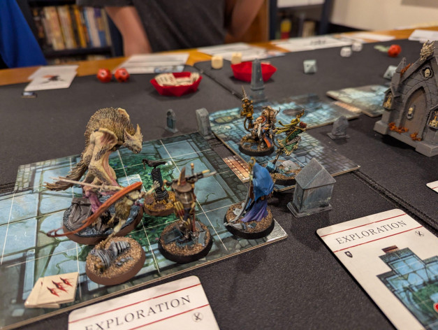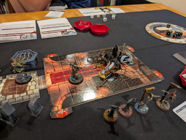 We did it! We beat Radukar! It took us years, but we did it! Spoiler alert below… Spoiler alert!! Don’t read unless you’ve completed the core game. There was definitely a difficulty curve to the game. The middle was where it was the hardest. We breezed through the Ven Alten triplets, and Radukar didn’t put up too much of a fight either. The final three vampires charged us on turn 1, and we chopped them all down. Second and third turns we got into positions, there were no reinforcements. Fourth turn we start shattering philactries. Radukar is now on the board. We smash 3 philactries, and attack Radukar, he’s down to one wound remaining. Radukar activates and attacks two heroes, stunning them. Jelsen is last. He rushes into the Nightguard room, smashes the philactry, runs out, shoots at Radukar and misses… With the final destiny die, he takes carefully aim…