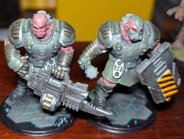 Here’s a poor picture of quick paint jobs on some proxies for the retinue characters the Broggan Brothers in Blackstone Fortress. These guys are House Bharteth – Law Enforcement Ogre/Ogryns I was going back and forth between those and these. I went with the House Bharthen models because I liked their look just a bit more. Some passable free options are here, and here.