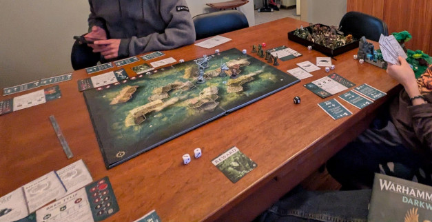 Warhammer Quest: Darkwater The game guys got together and we played a few rounds of Darkwater. It was fun! We were able to *somewhat* complete the missions and escape without too much trouble. There was one scenario that the board was flooding and our moves were hindered. Yeah, we paced it out and there is no solution that allows us to make it to the exit in time. So we stretched the rules a bit. Unwinable. Maybe there’s a treasure that allows you to walk on water somehow. Again, setup is SO QUICK. That’s a real highlight. You can play multiple scnerarios without a big break to reset.