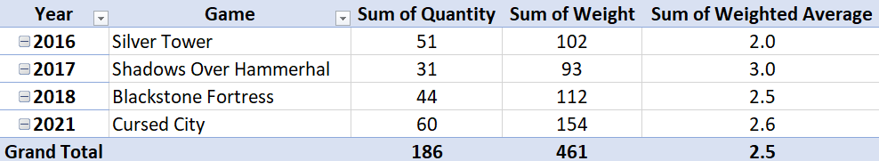 The number of miniatures tells you something, but not the whole story. So I went through and graded the miniatures based on the perceived rigor necessary to paint. Here’s my grading scheme: