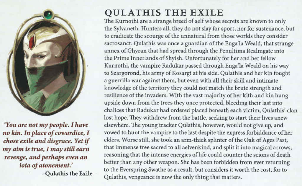 The Quest Book shares some juicy info about how Qulathis stole “an arm-thick splinter of the Oak of Ages Past… and split it into magical arrows”, thus becoming Qulathis the Exile.