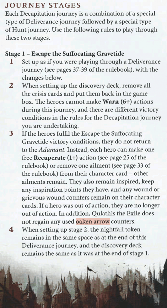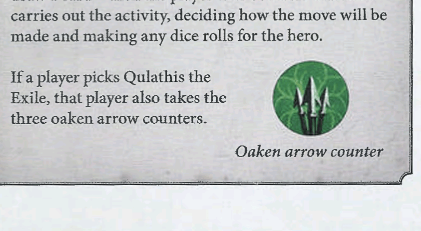 Once the three arrows are used, are they gone forever? No! Qulathis has three arrows to use on every adventure. How do I know this? It’s because of WHERE in the rulebook they’re mentioned. It’s in the Getting Ready to Play section. Those steps are followed before every adventure, therefore Qulathis always starts with three oaken arrows. Tricky, huh? There’s a real economy of words in this rulebook. You have to look at what the rule says, what it doesn’t say, and where it says it!