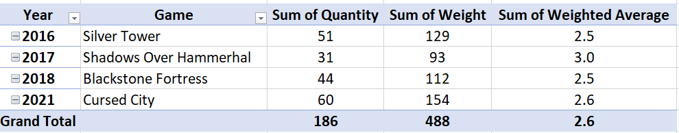The updated table below shows Silver Tower jumping from a weighted average of 2.0 to 2.5. Quite a leap. Right up there with Blackstone Fortress.