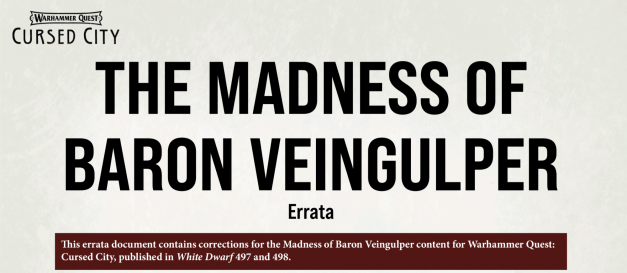 Attention everyone! Stop what you’re doing and read the eratta from Games Workshop, fixing the errors with The Madness of Baron Veingulper. Huge thanks to Nicholas Linindoll in the Cursed City Facebook group for pushing GW to move on the fix. It’s nice when non-free expansion material is playable. I’m equal parts glad and surprised this was released. GW addressed the mistakes and omittions necessary to be Rules-As-Written slaughtered by an avalanche of bloodthirsty cannibals. Doorway rules are included, map corrections, as well as the card for Crypt Haunter Courtiers! They will beat your heroes to death, no joke.