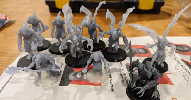 Some speculative clarification on the big ghouls. It looks like you need these models to play: 2 Crypt Flayer, 1 Crypt Infernal Courtier 2 Crypt Horrors, 1 Crypt Haunter Courtier So in “Our Enemies Sally Forth”, use 2 Crypt Horrors, 1 Crypt Haunter Courtier This is an improvement, because that scenario had called for 3 Crypt Haunter Courtiers, which pushed the big ghoul model count over 6, which would have meant another kit was necessary to build everything necessary. However, we still need the card for the Crypt Haunter Courtier. The good news is that my 3D proxies are ready to go! However, if I knew I only needed two Crypt Horrors, I wouldn’t have printed three. I would have fired off a Crypt Haunter Courtier that I mocked up. I may still print it, or I’ll just paint one of the Crypt Horrors white and red to differentiate it…